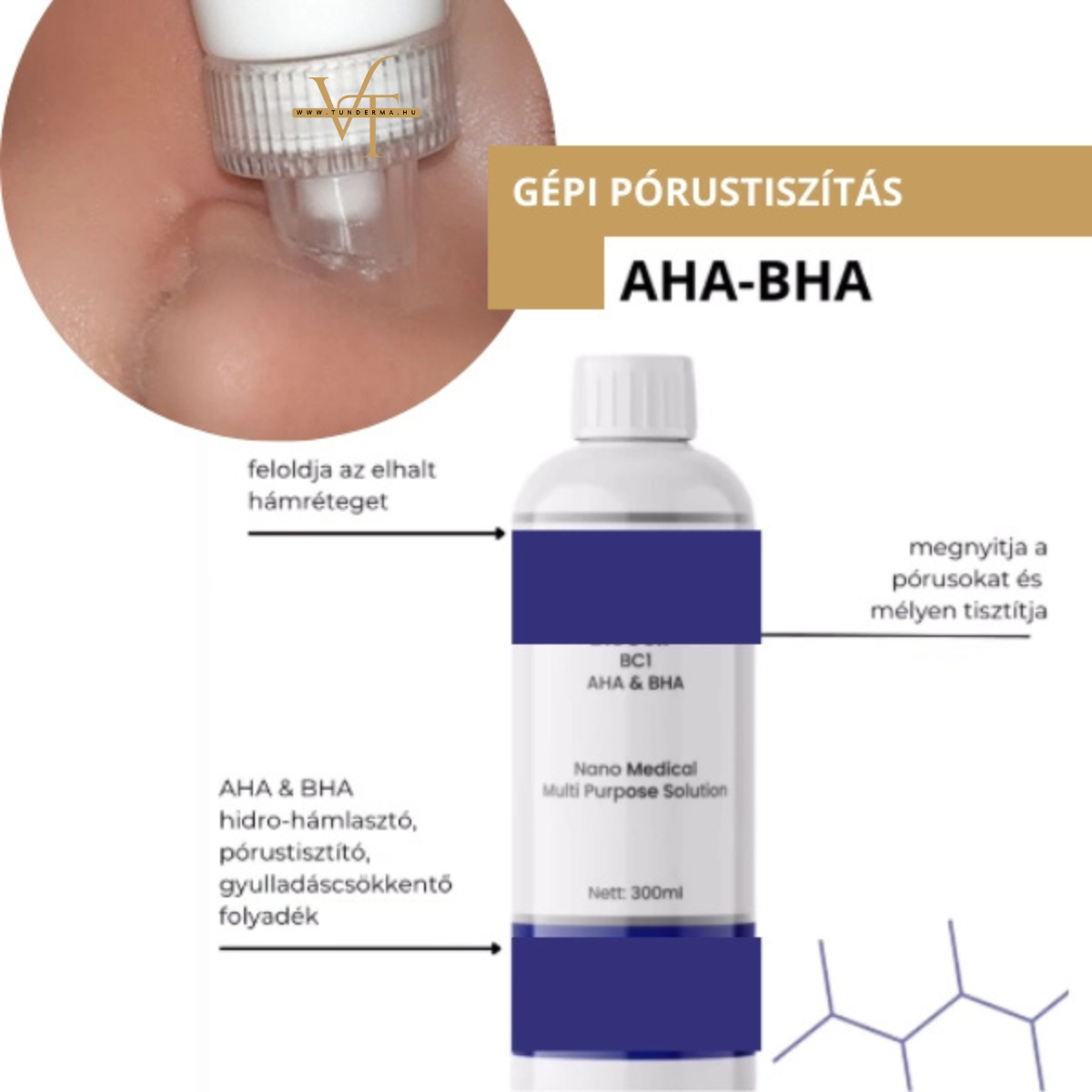 A tisztítási folyamatot egy modern AHA, BHA és PHA savkombinációval támogatjuk meg.